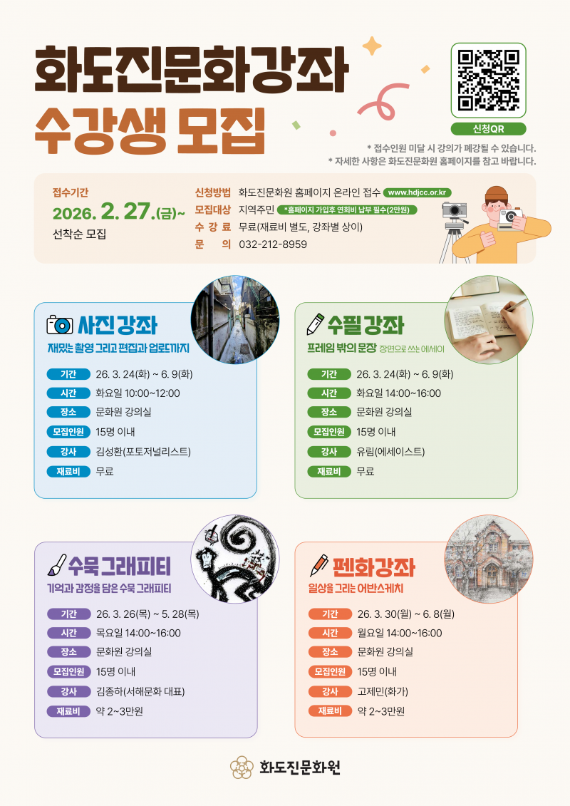 3월부터 진행되는 화도진문화강좌의 수강생 모집이 오는 2월 27일부터 진행됩니다.